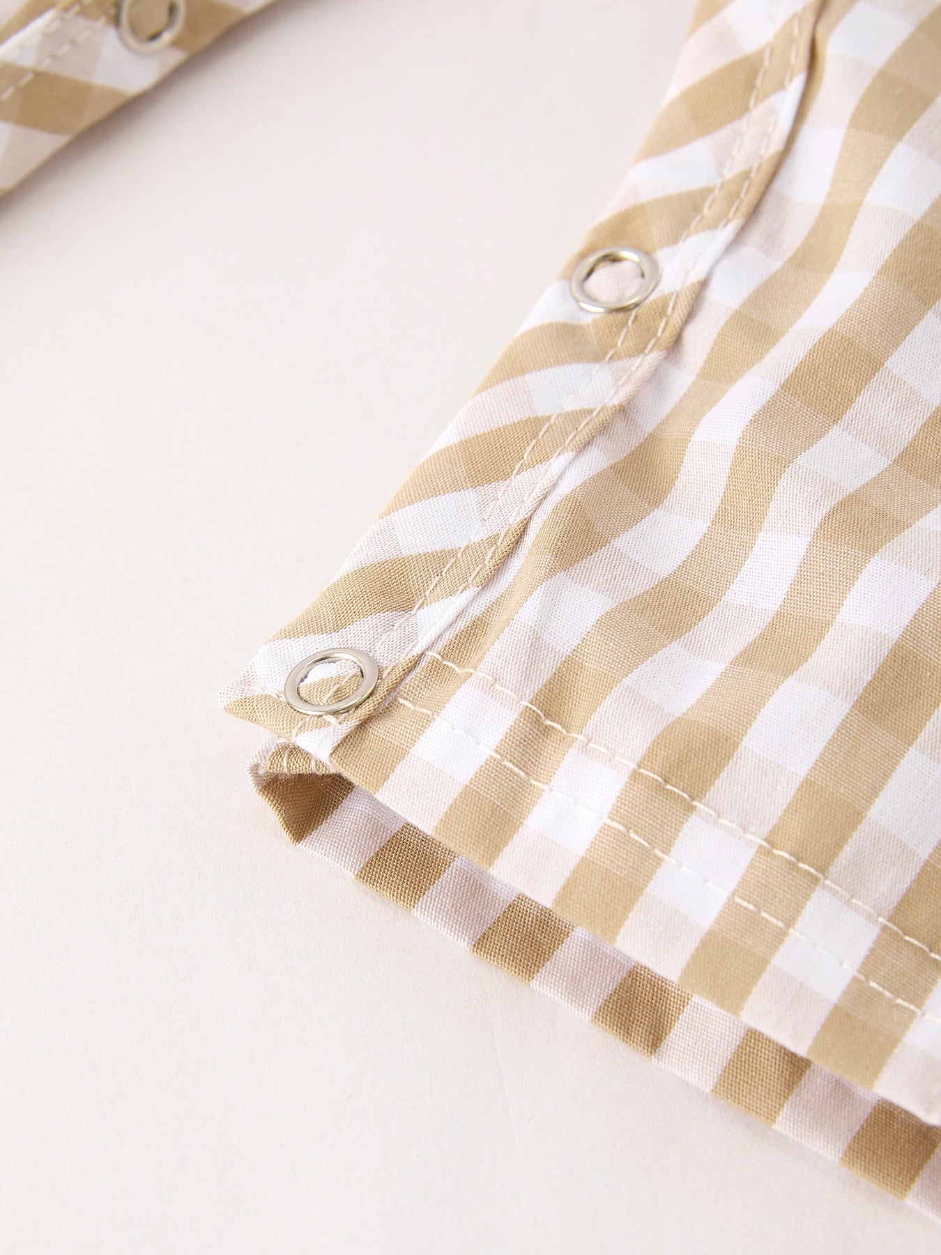 Dress your little one in cozy charm this season with the Fall Thanksgiving Apricot Plaid Chick Embroidery Smocking Baby Boys Romper. Featuring delicate smocking and adorable chick embroidery on a warm apricot plaid, this romper blends festive style with soft comfort. Perfect for holiday gatherings, it keeps your baby looking cute and feeling snug all day long.