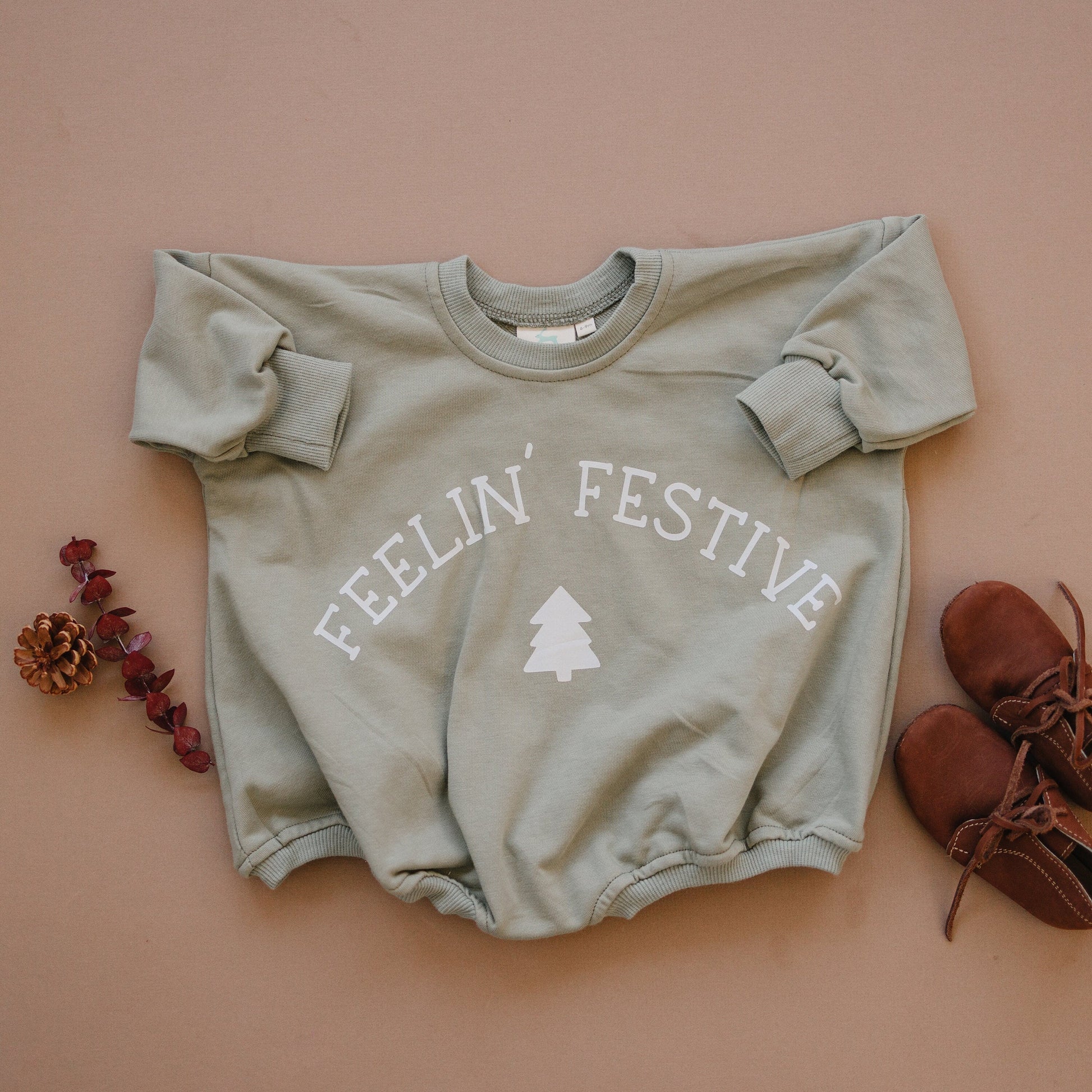 "Feelin' Festive" graphic oversized sweatshirt romper with snaps at crotch. Lightweight terry material.