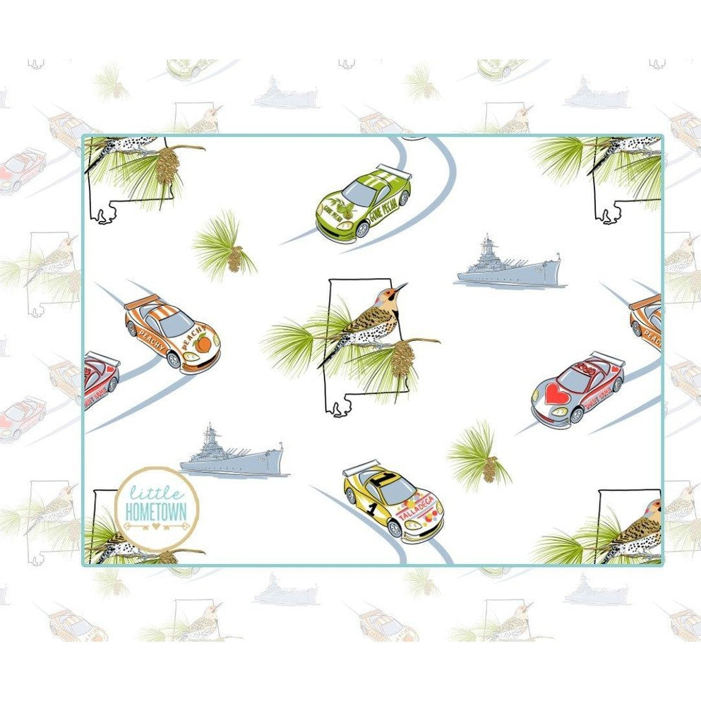 The perfect gift for an Alabama baby with pine trees, Northern Flicker Yellowhammer birds, U.S.S. Alabama, and race cars with nods to Talladega, pecans, and peaches.