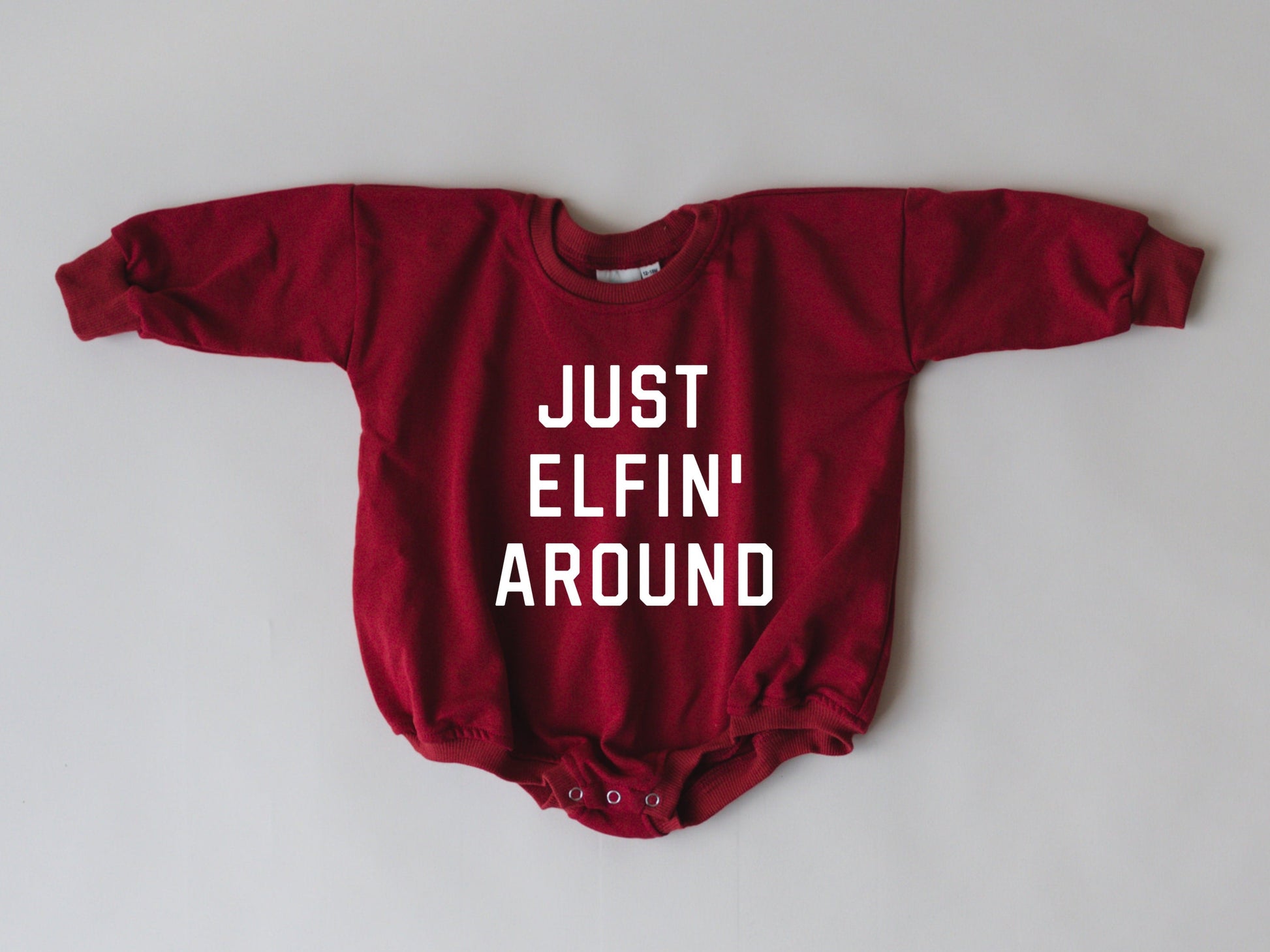 Just Elfin' Around graphic oversized sweatshirt romper with snaps at crotch. Lightweight terry material.