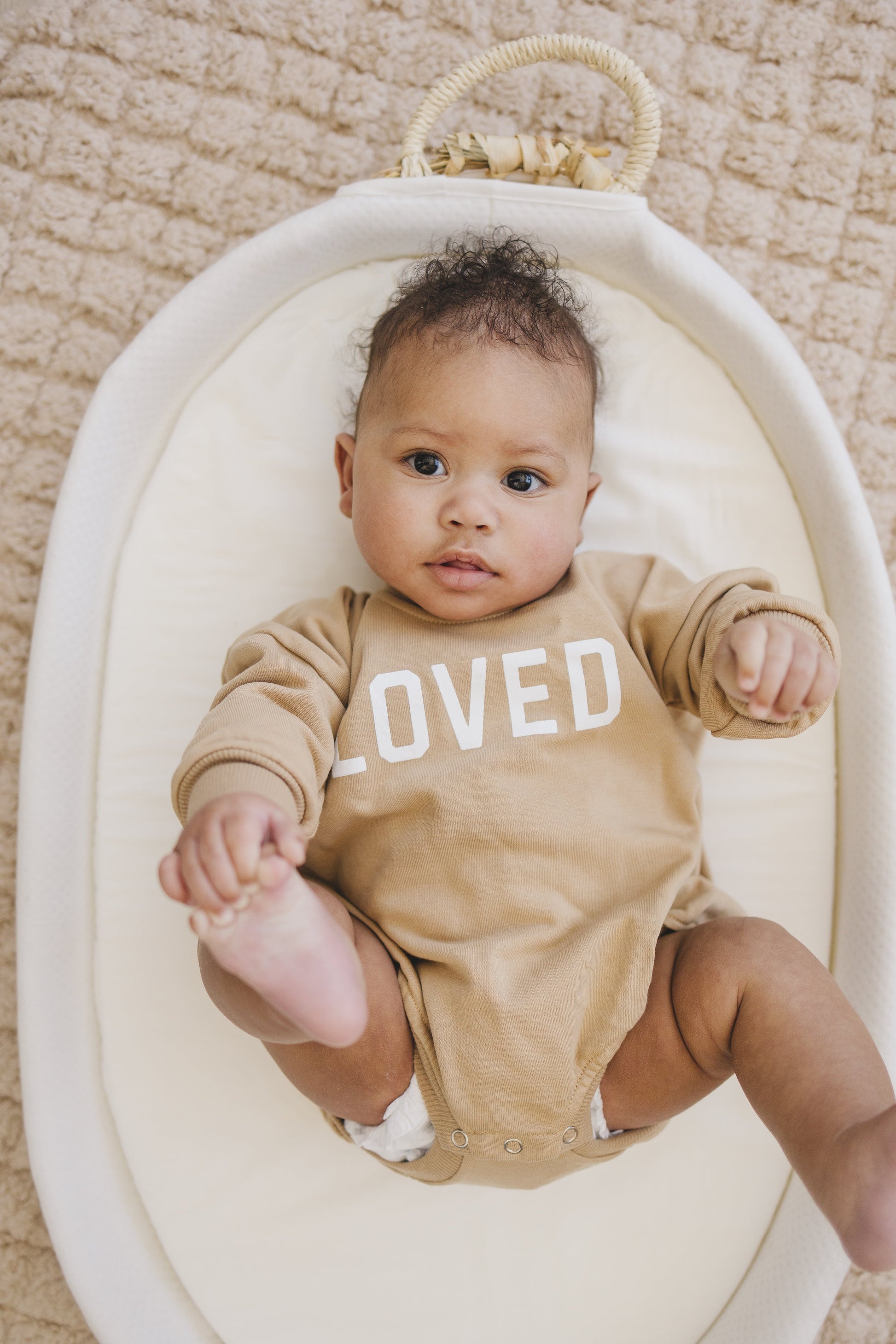 Loved graphic oversized sweatshirt romper with snaps at crotch. Lightweight cotton terry material with the perfect amount of festive for your valentine's festivities.