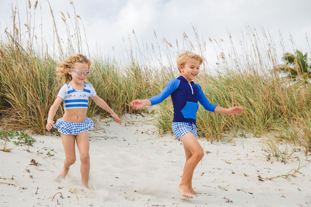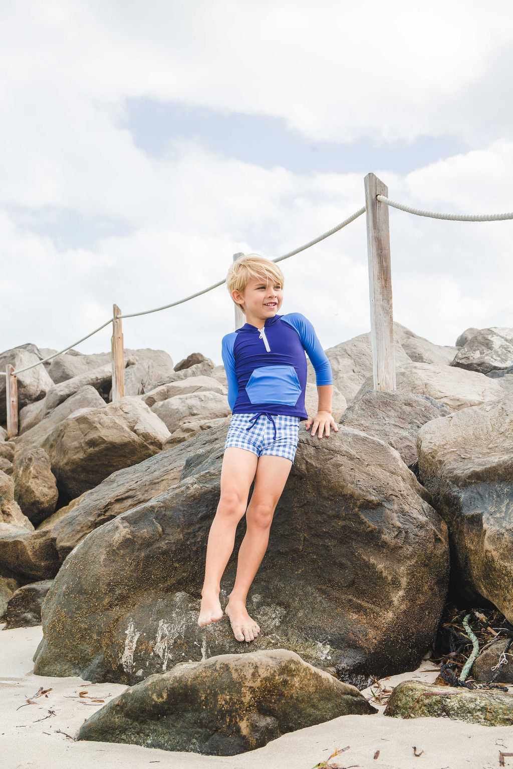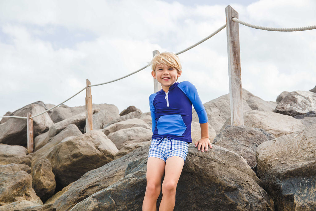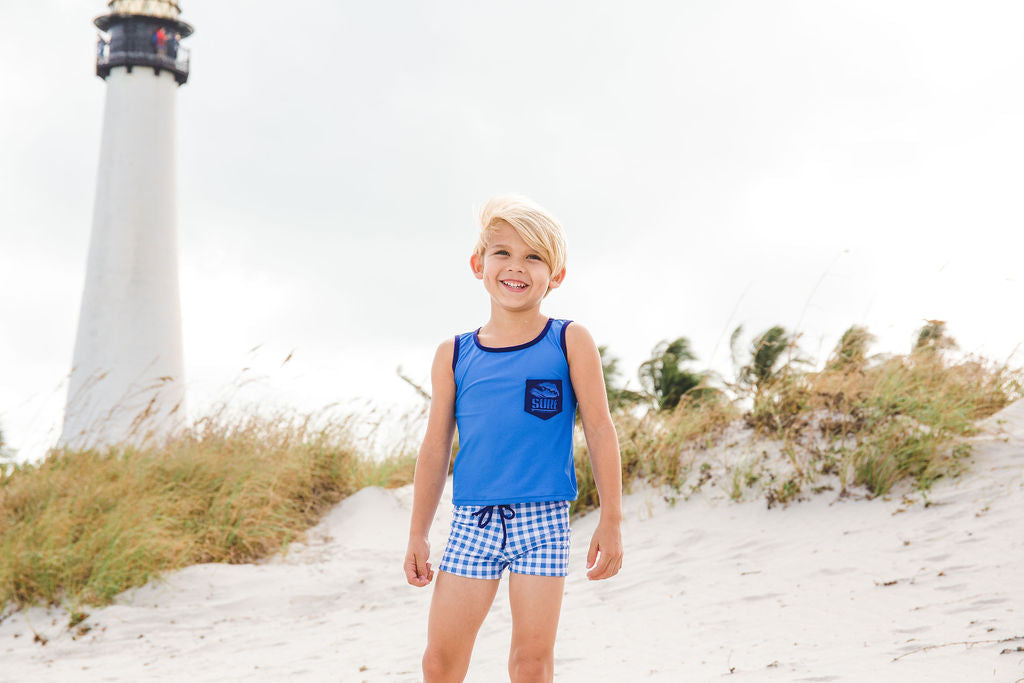 Print: The swim briefs are made with our classic, signature blue and white check fabric which coordinates with many of our girl styles. The contrast colored drawstring brings in a pop of navy blue.