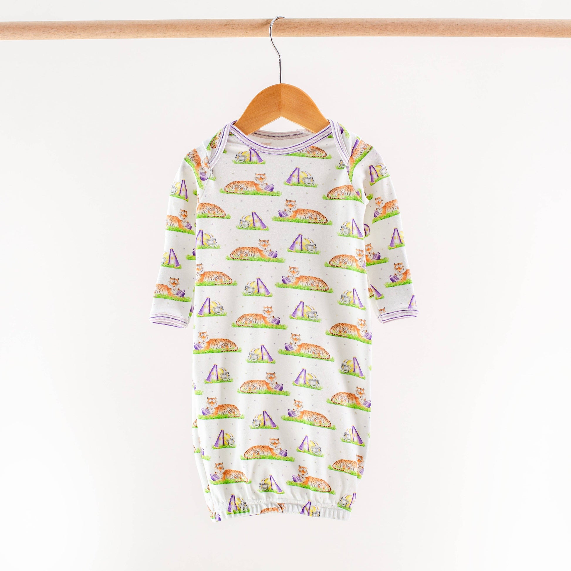 Featuring a playful print of tigers, tents, and Louisiana flair with purple-striped cuffs, neckline, and waistband, this pajama set is perfect for storytime, bedtime, and all-night comfort.
