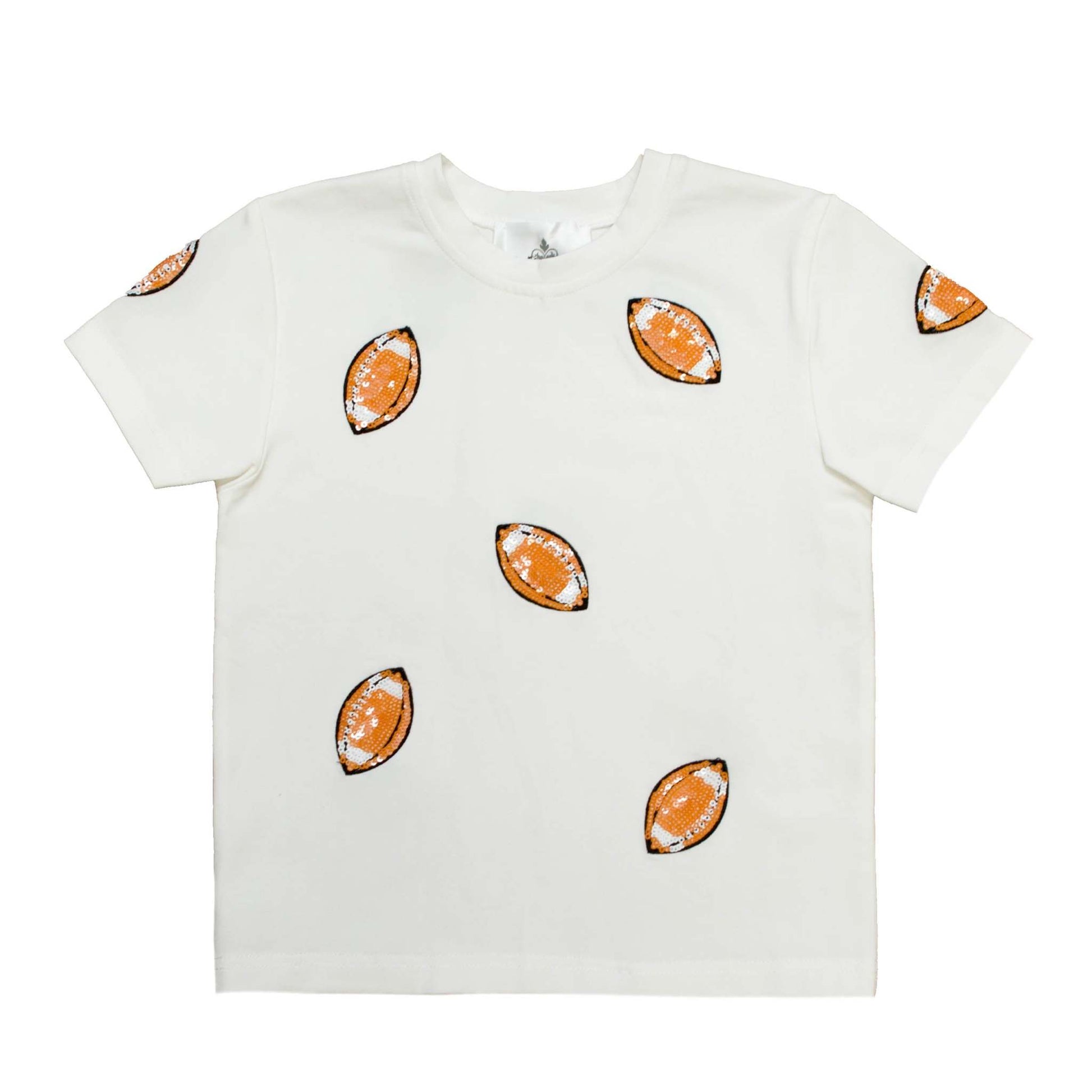 Score a fashion touchdown with our Orange Football Sequin Kid Shirt! This sparkly and sporty shirt is perfect for the little athlete in your life. With its bold orange color and fun sequin detailing, your child will be the talk of the field (or playground). Game on!