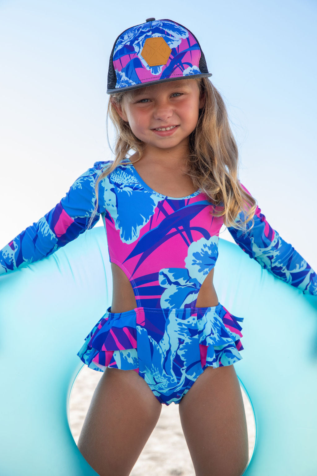 Print: This bright fushia print has shades of blue and hawaiian flowers throughout giving it the ultimate tropical feel. The Mesh and bill of this hat is a charcoal grey color.