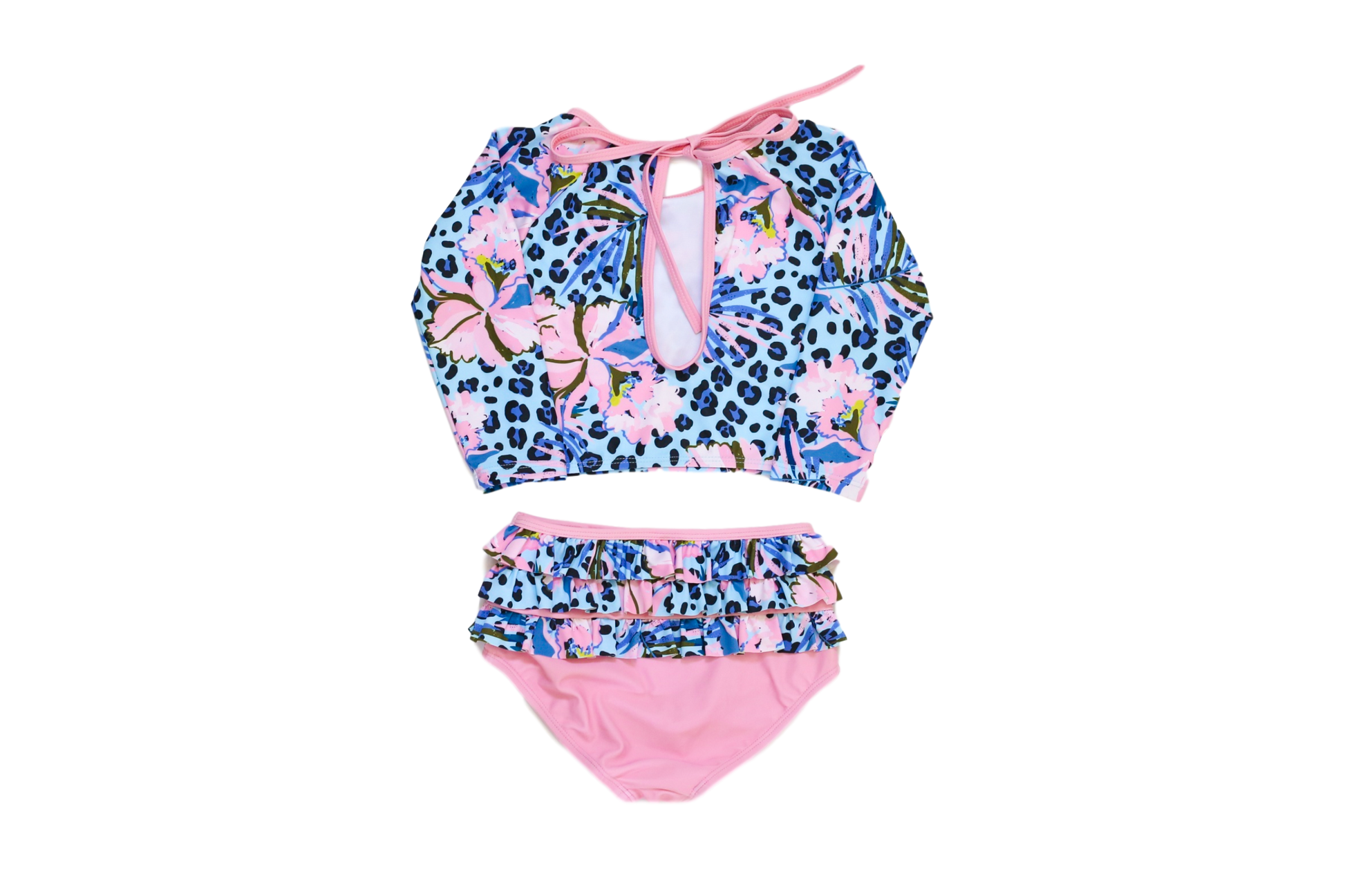 Style: This two piece style is classic and feminine showcasing rows of soft ruffles draped along the sides and back of the bottoms. The top is a mid length sleeve rash guard with a tie closure on the back to ensure the perfect fit.