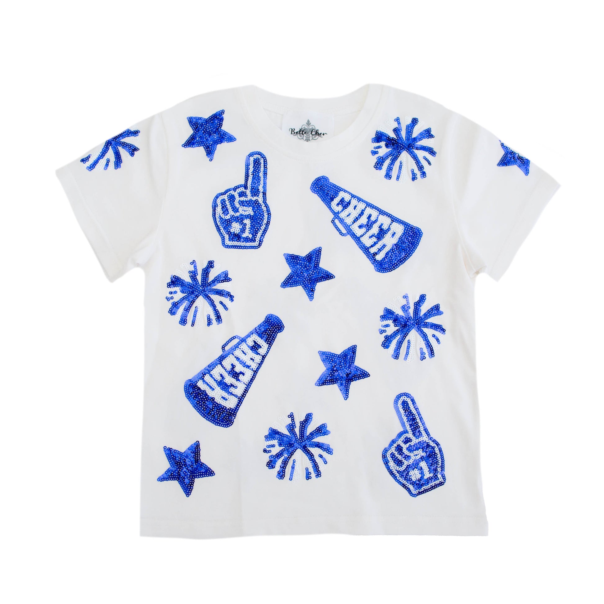 Show your team spirit in style with this Royal Blue and White Cheer Shirt. Featuring vibrant colors and a comfortable fit, it’s perfect for cheering on your favorite team or adding a pop of fun to your casual wardrobe. Celebrate every win with energy and flair!