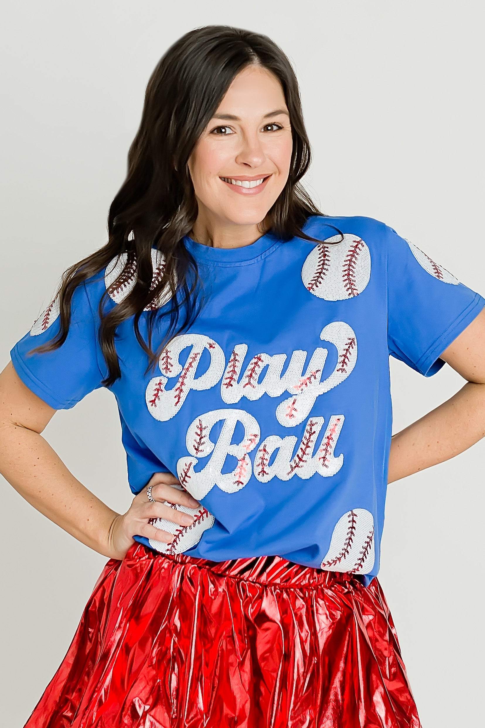 Gear up for gameday in this Royal Blue Play Ball Adult Shirt. With playful sequin detailing and a baseball-inspired design, you'll be ready to hit it out of the park. Perfect for fans and players alike.