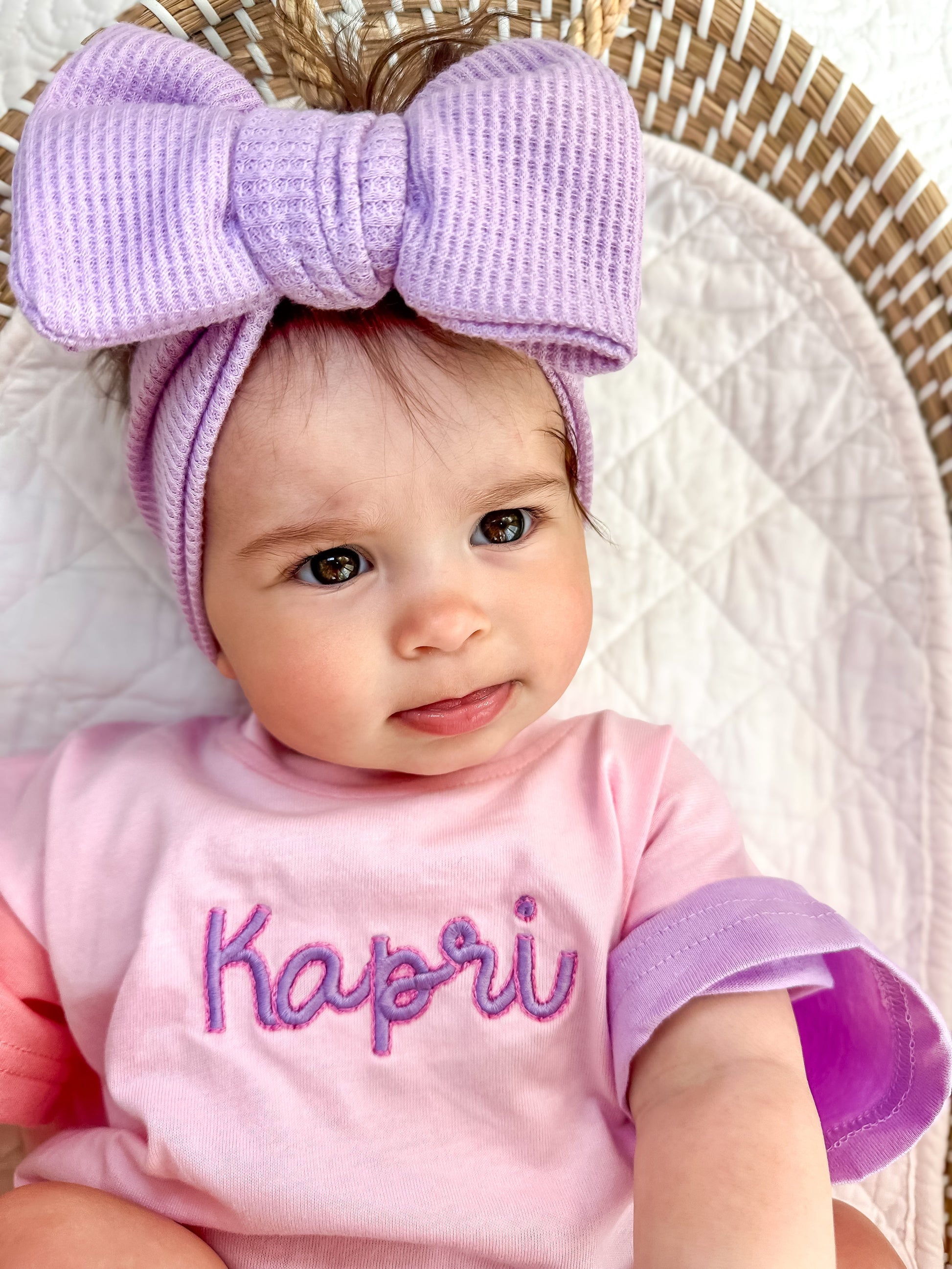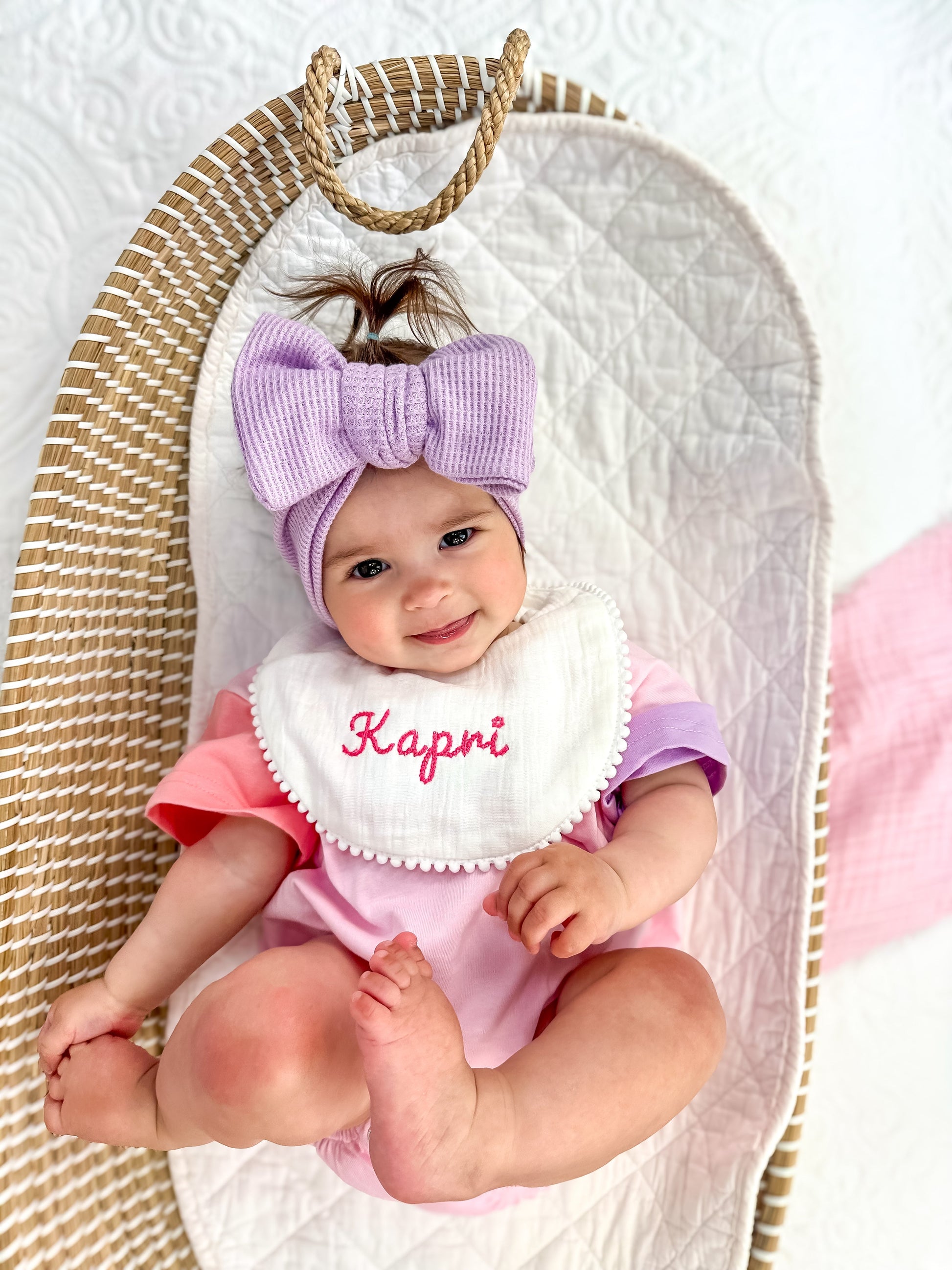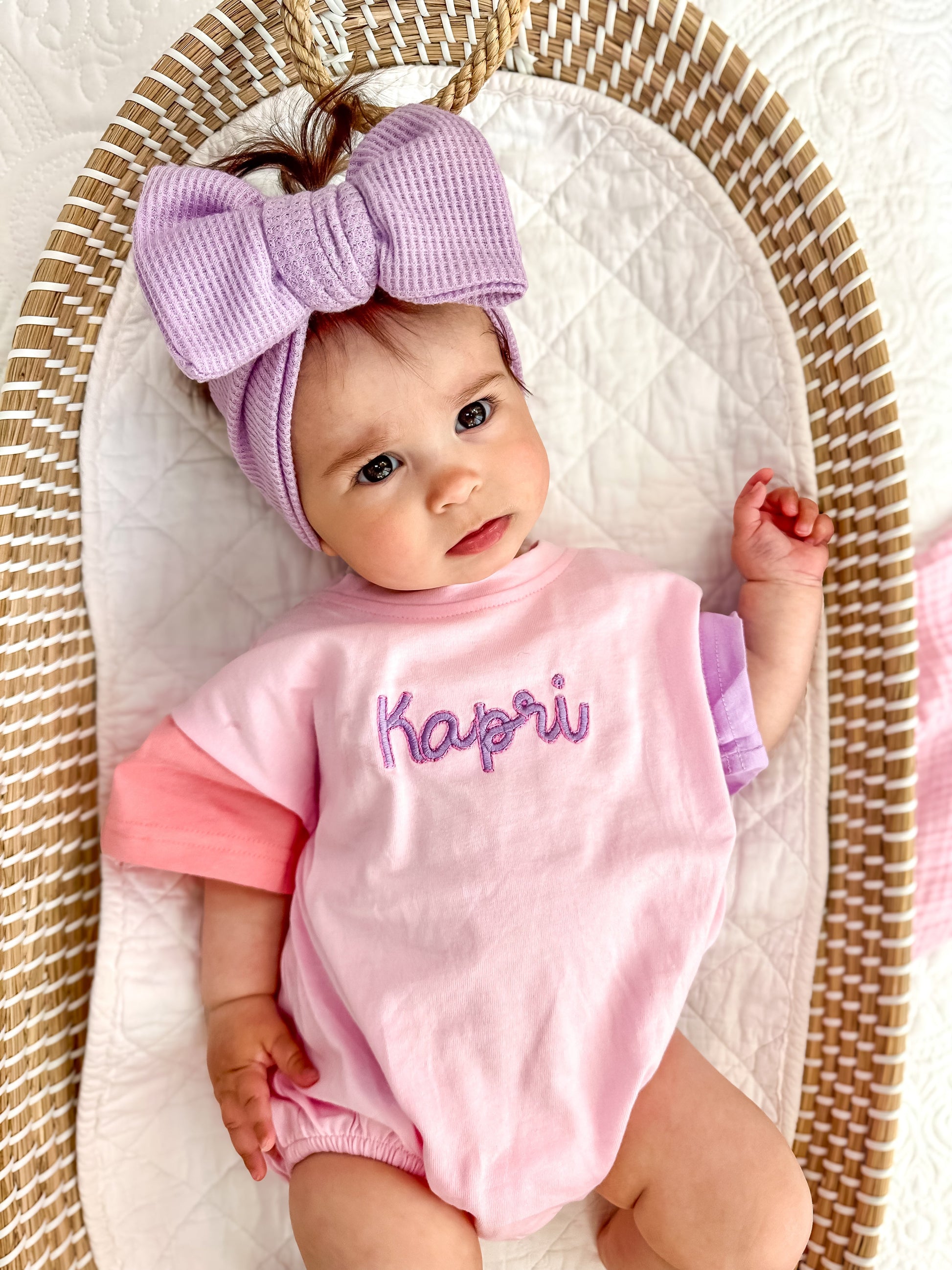 Available in a one size fits most, roughly Newborn to 3T+. Approximately 6.75" across when lying flat, 3.5" wide.
