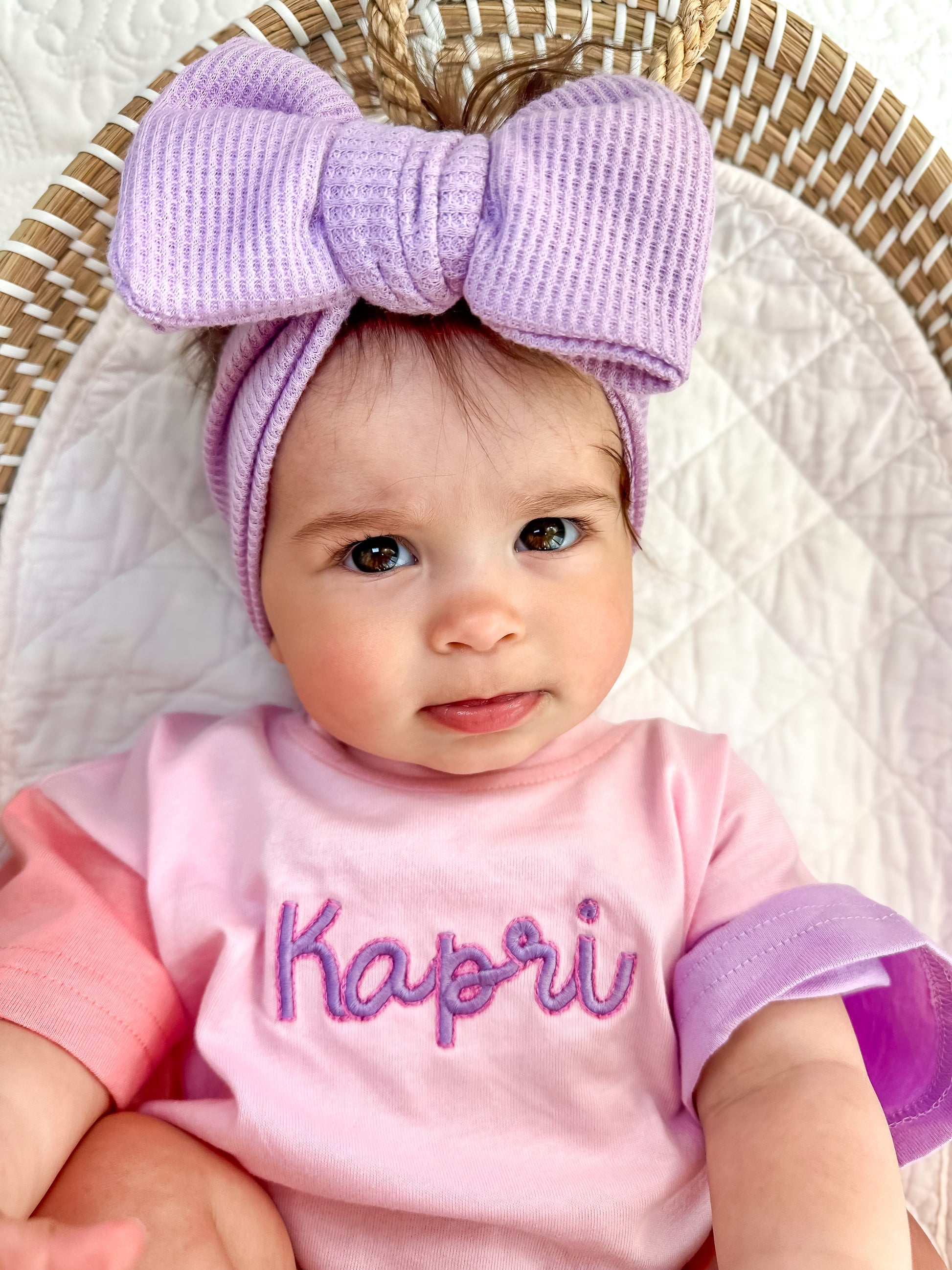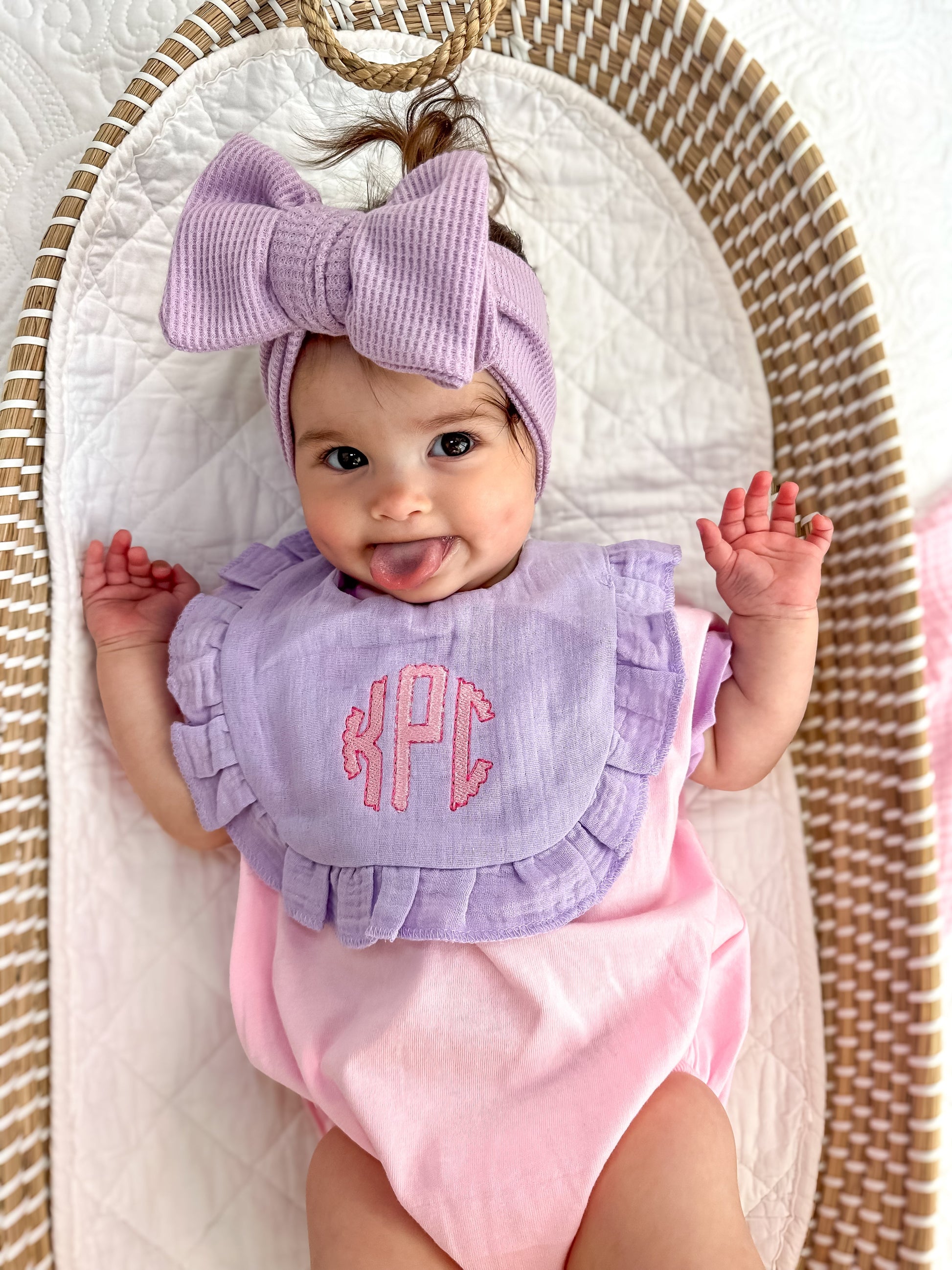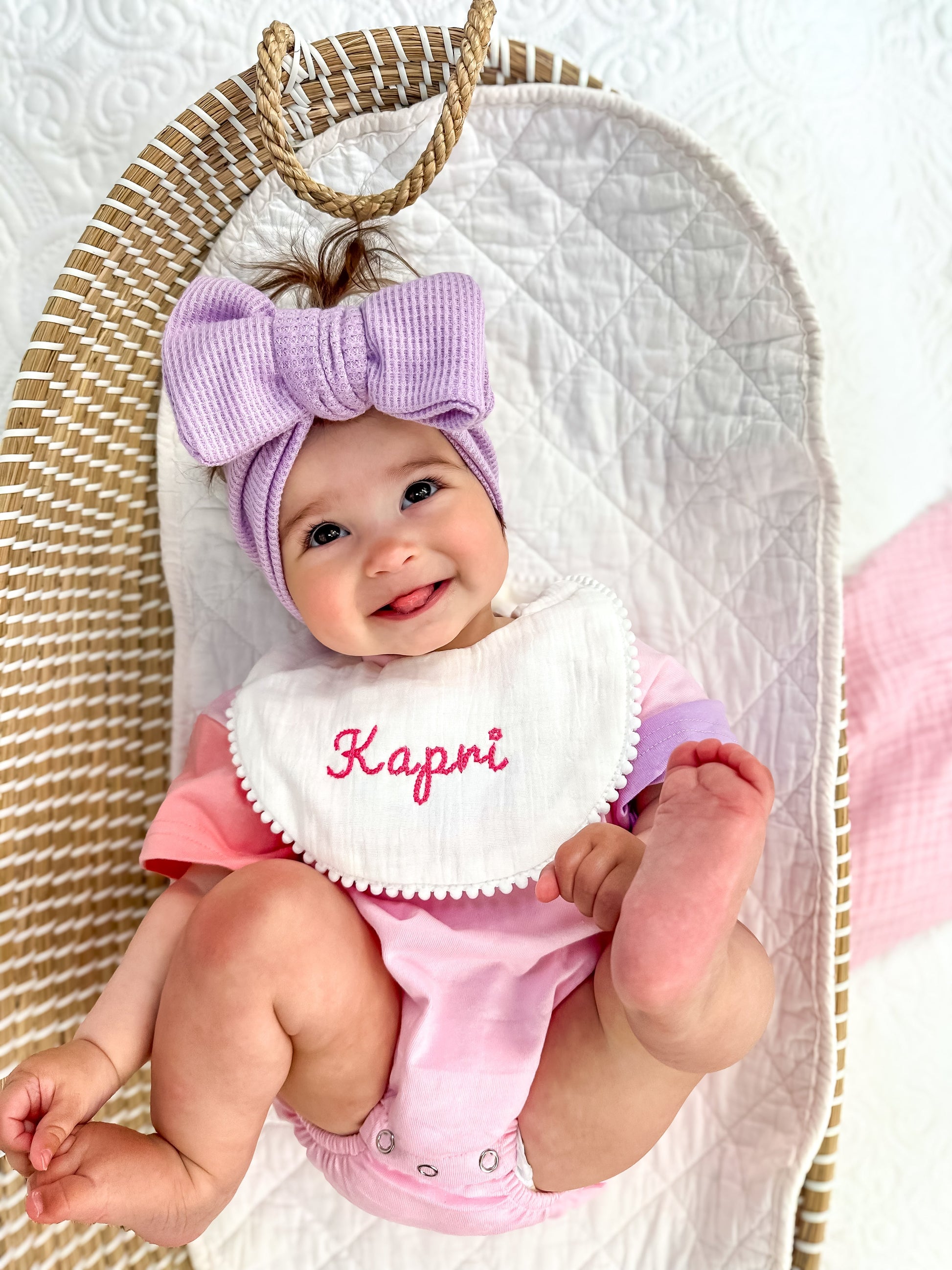 Available in a one size fits most, roughly Newborn to 3T+. Approximately 6.75" across when lying flat, 3.5" wide.