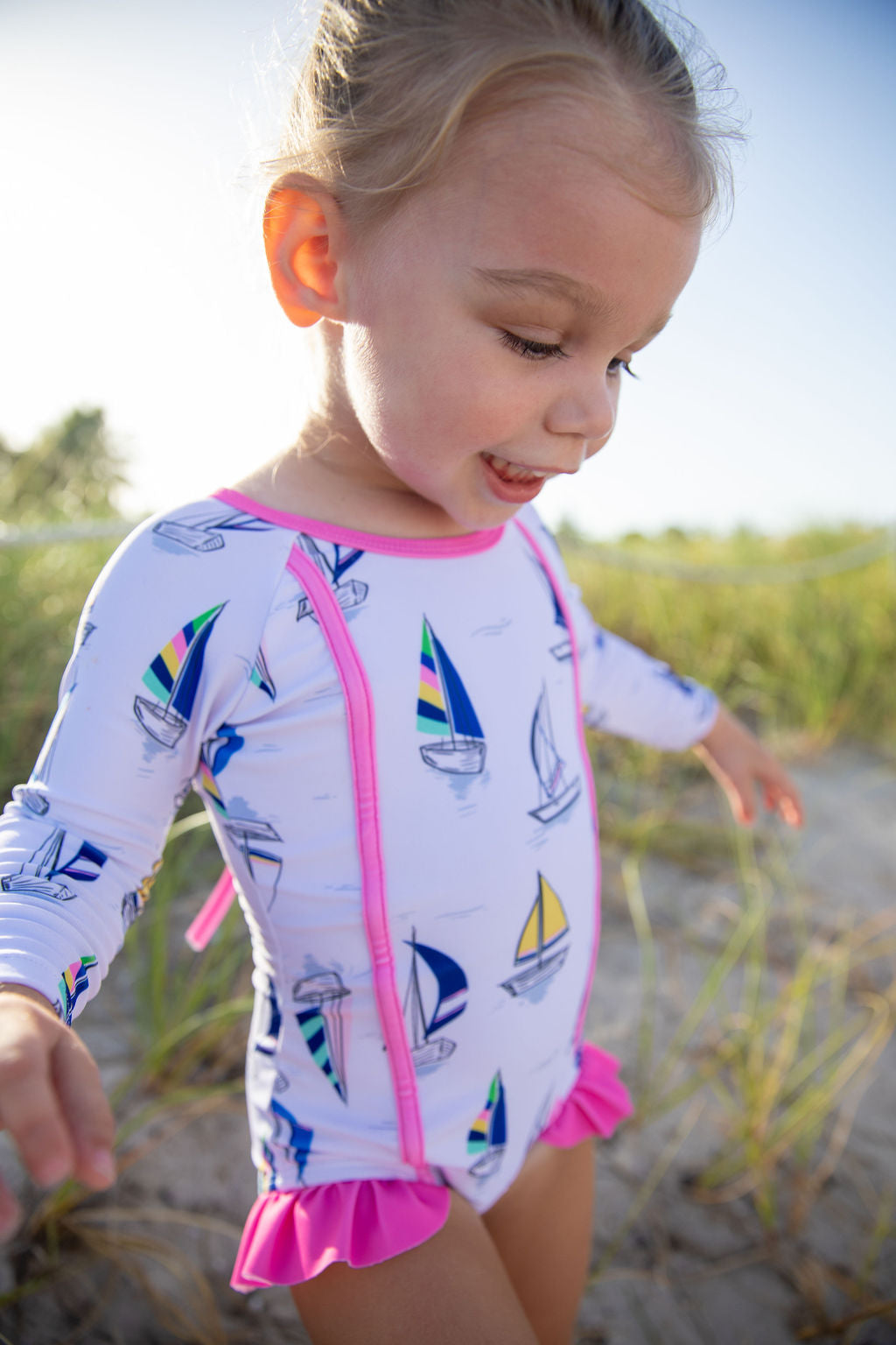 Print: This print features a nautical inspired clean and classic print with dainty sailboat sketches with pops of color.