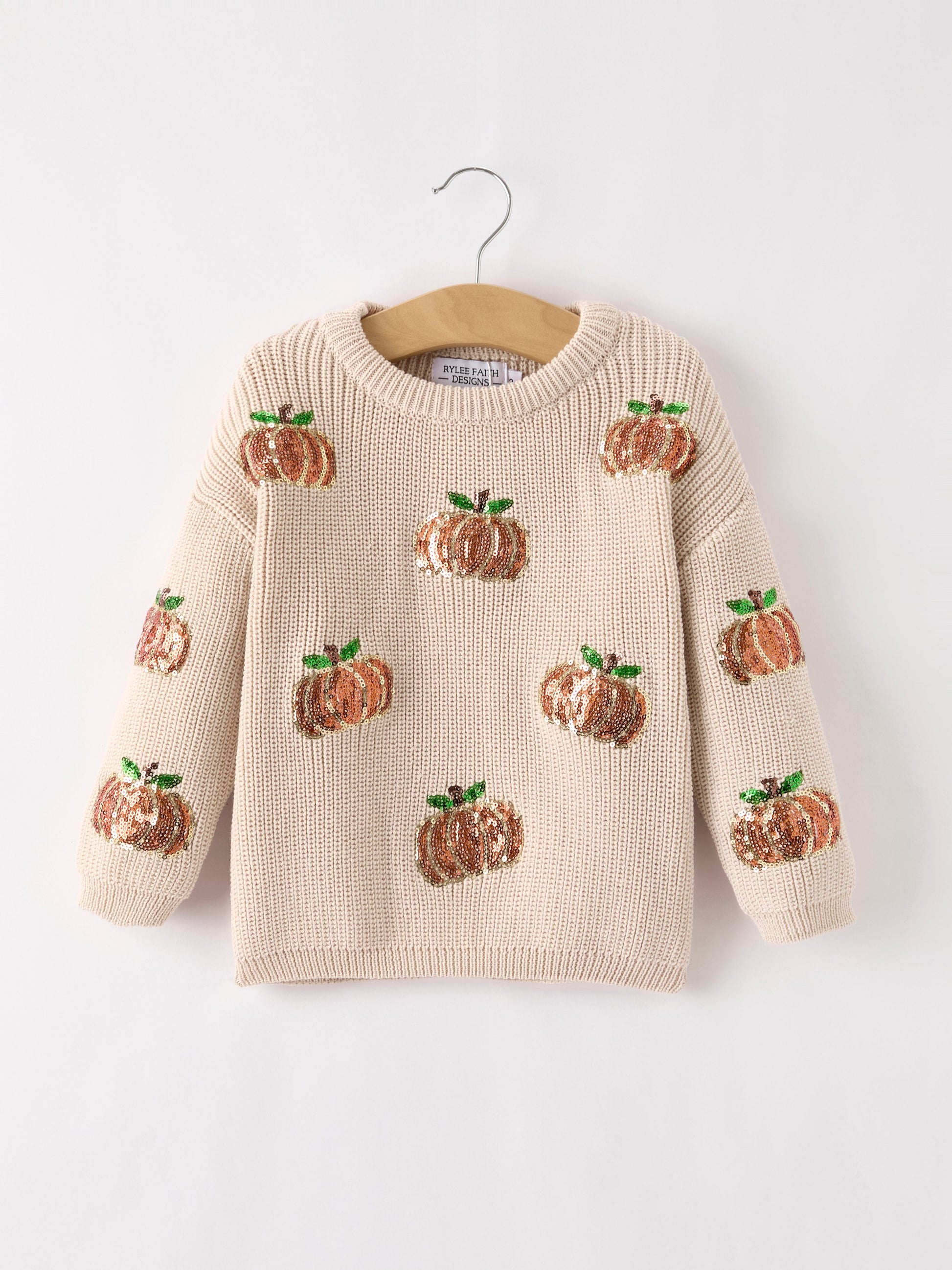 Thanksgiving Pumpkin Sequin Sweater – Beige, Perfect for Fall